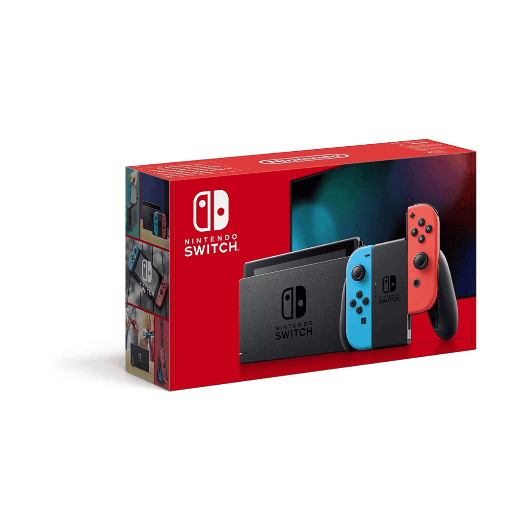 - La confezione contiene: console, base per Nintendo Switch, un Joy-Con sinistro (blu/neon), un Joy-Con destro (rosso/neon), impugnatura joy-con, alimentatore, un set di laccetti per Joy-Con, cavo HDMI